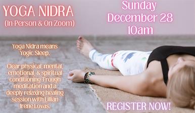 Yoga Nidra means Yogic Sleep. It is beyond dreaming and the waking state. It is a deeply relaxing state where one can purify the past, present and future. In this deep sleep state, you will be guided to progressively go deeper into your own being, aligning with Spirit. Energetic healing will be occurring simultaneously to clear physical, mental, emotional, spiritual, psychic and psychological conditioning. Deep relaxation, meditation and healing session with Lillian Irene Lovas. $15